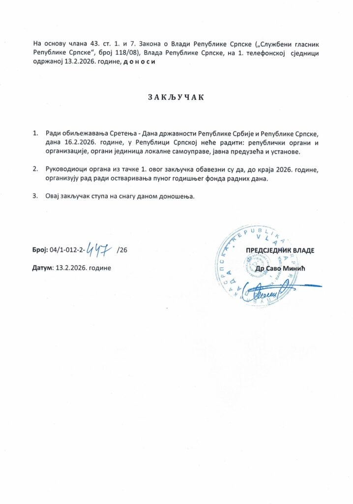 Влада Републике Српске данас је, на телефонској сједници, донијела закључак којим се, ради обиљежавања Сретења – Дана државности Републике Србије и Дана државности Републике Српске, понедјељак 16. фебруар, проглашава нерадним даном.