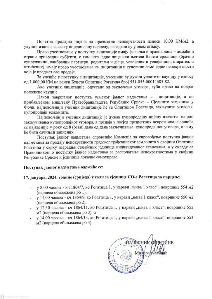 Javni oglas za sprovođenje postupka usmenog javnog nadmetanja – licitacije radi prodaje gradskog građevinskog zemljišta u svojini Opštine Rogatica, u svrhu izgradnje stambenih jedinica individualnog stanovanja