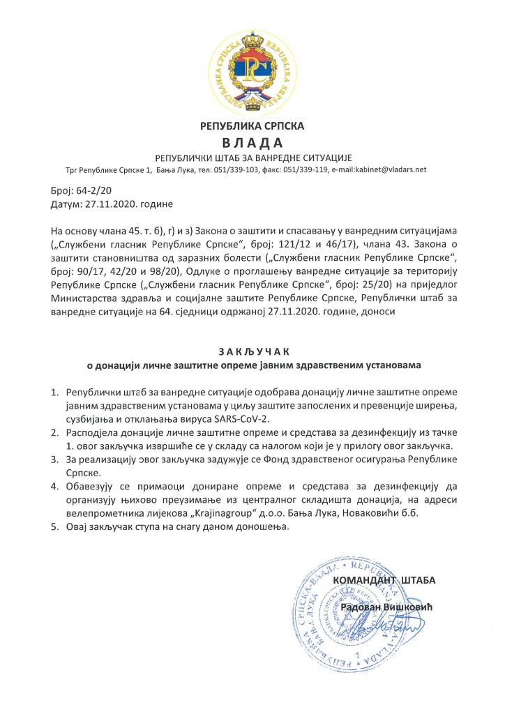 Закључак о донацији личне заштитне опреме јавним здравственим установама