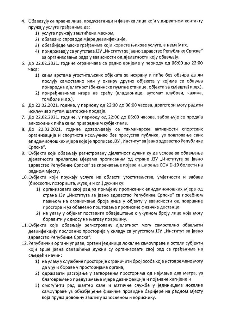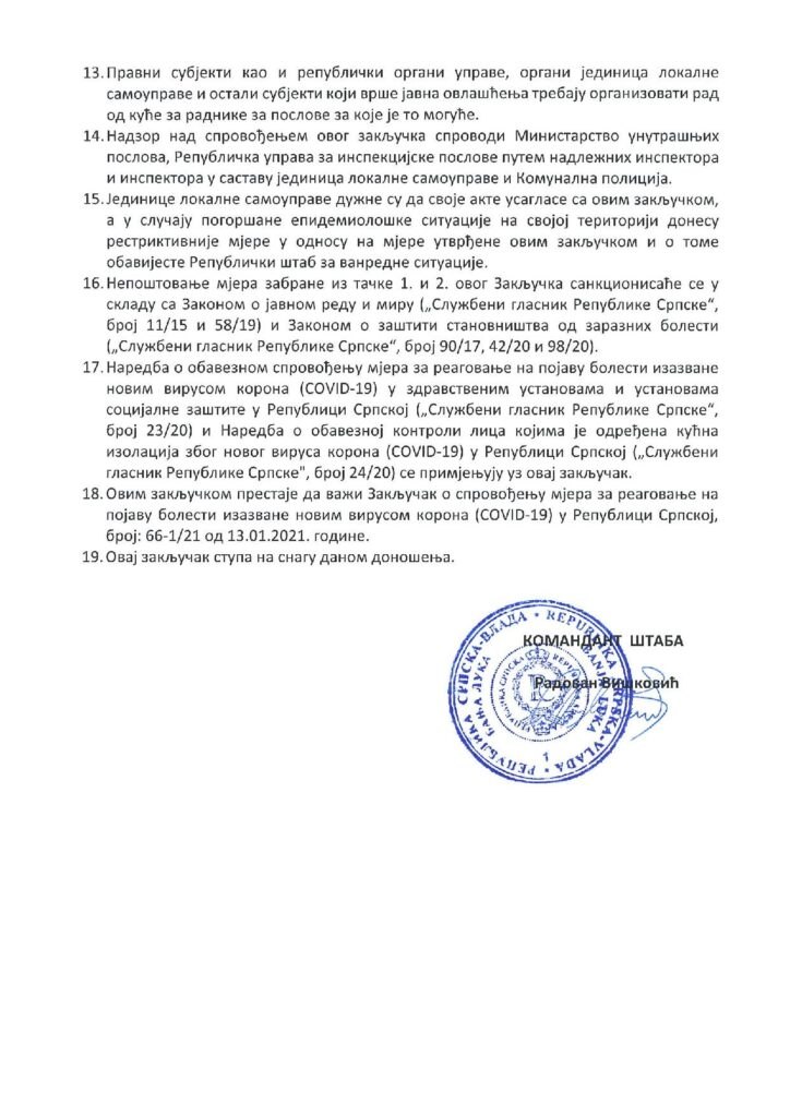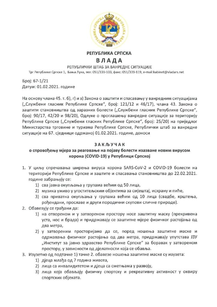 Закључак о спровођењу мјера за реаговање на појаву болести изазване новим вирусом корона (ковид-19) у Републици Српској