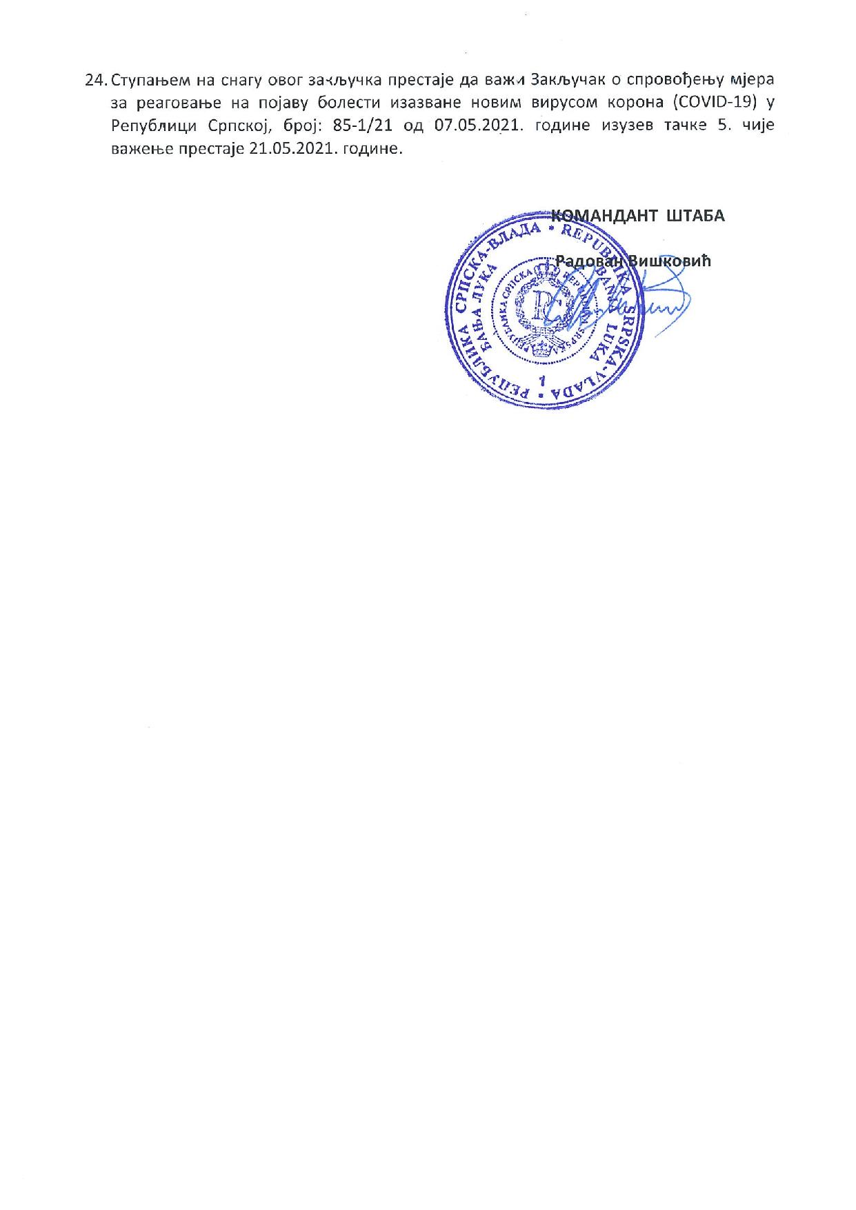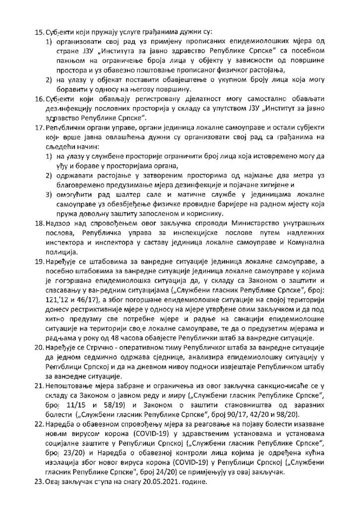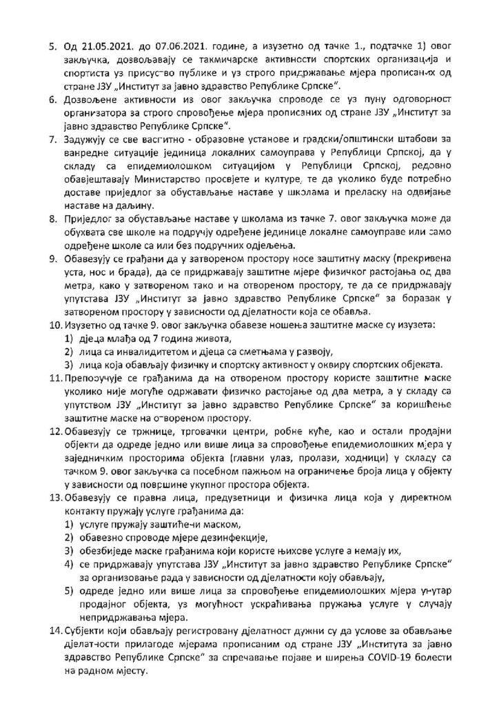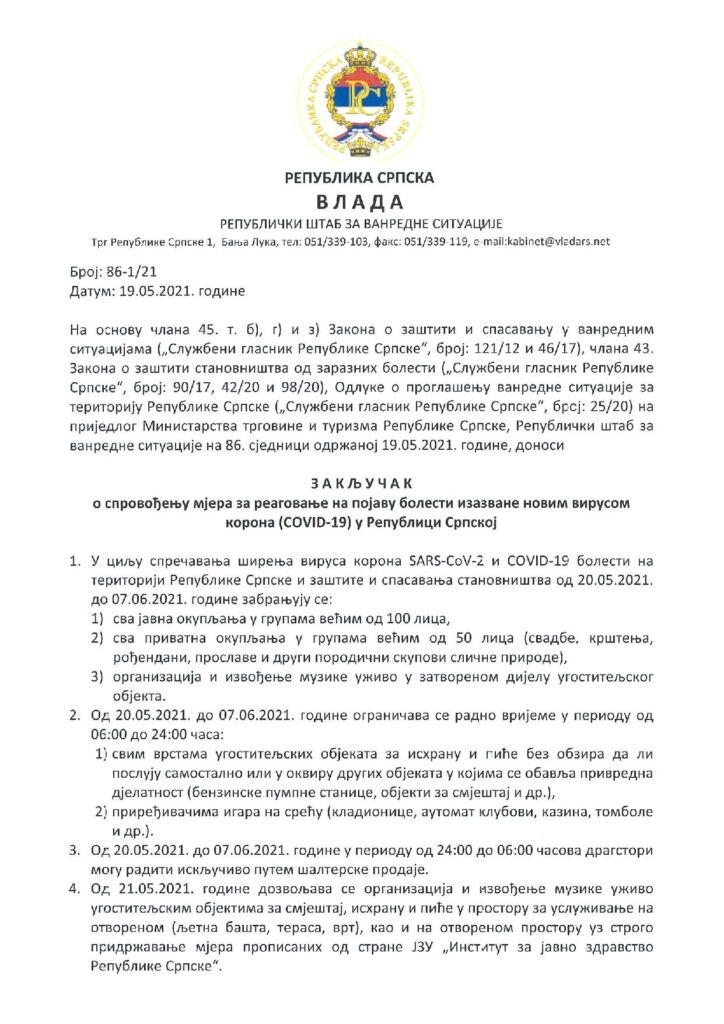 Закључак о спровођењу мјера за реговање на појаву болести изазване новим вирусом корона (COVID-19) у Републици Српској