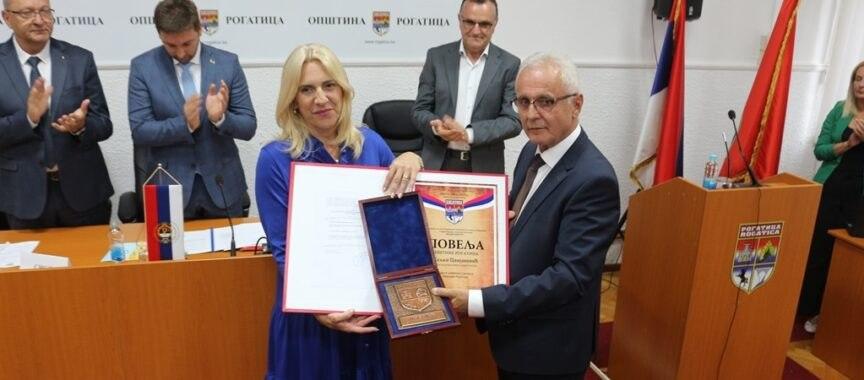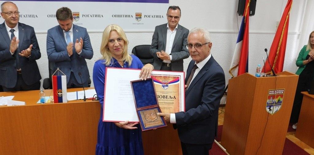 Предсједница Републике Српске Жељка Цвијановић изјавила је данас да је почаствована и поносна што јој је додијељена Повеља општине Рогатица за заједничке напоре и улагања у нашу општину и најавила да ће и у наредном периоду бити настављен развој Рогатице.