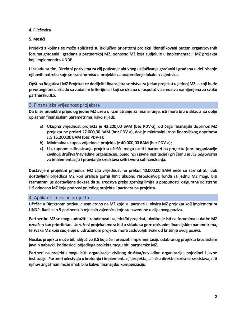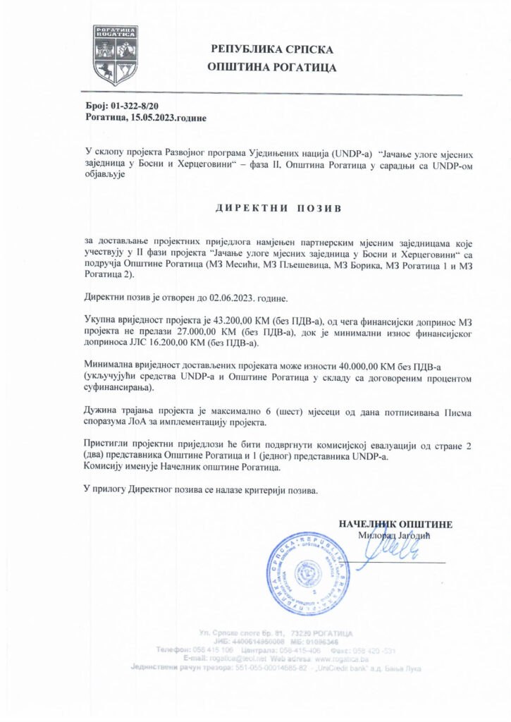 ОпштеДиректни позив за достављање пројектних приједлога намијењен партнерским мјесним заједницама које учествују у II фази пројекта “Јачање улоге мјесних заједница у Босни и Херцеговини” са подручја општине Рогатица (МЗ Месићи, МЗ Пљешевица, МЗ Борика, МЗ Рогатица 1 и 2)