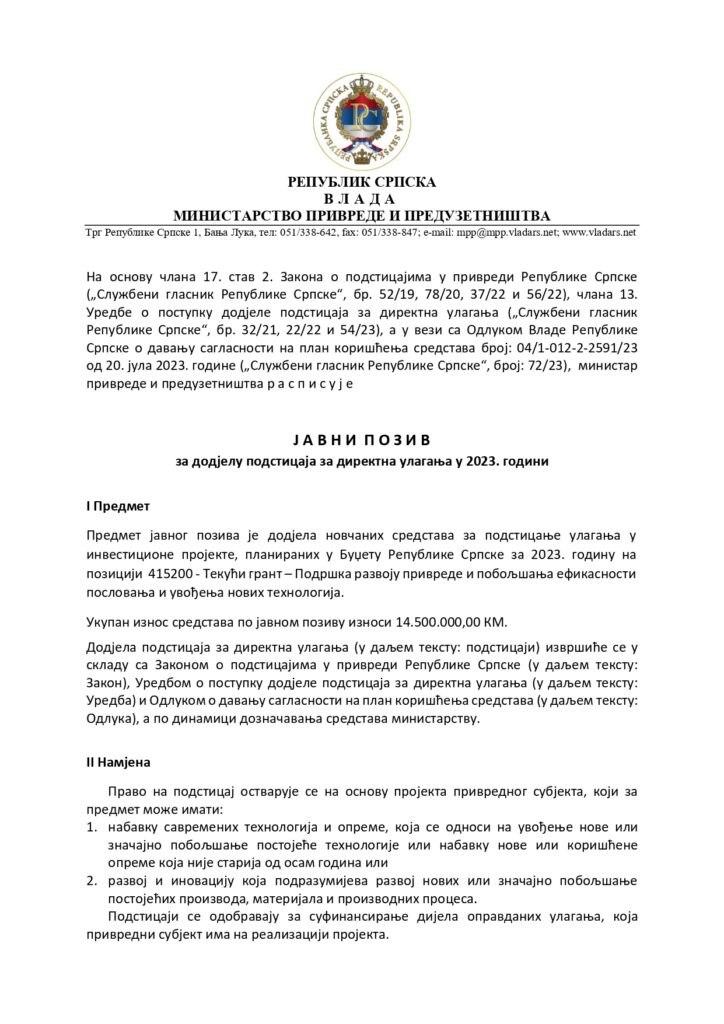 Јавни позив за додјелу подстицаја за директна улагања у 2023. години