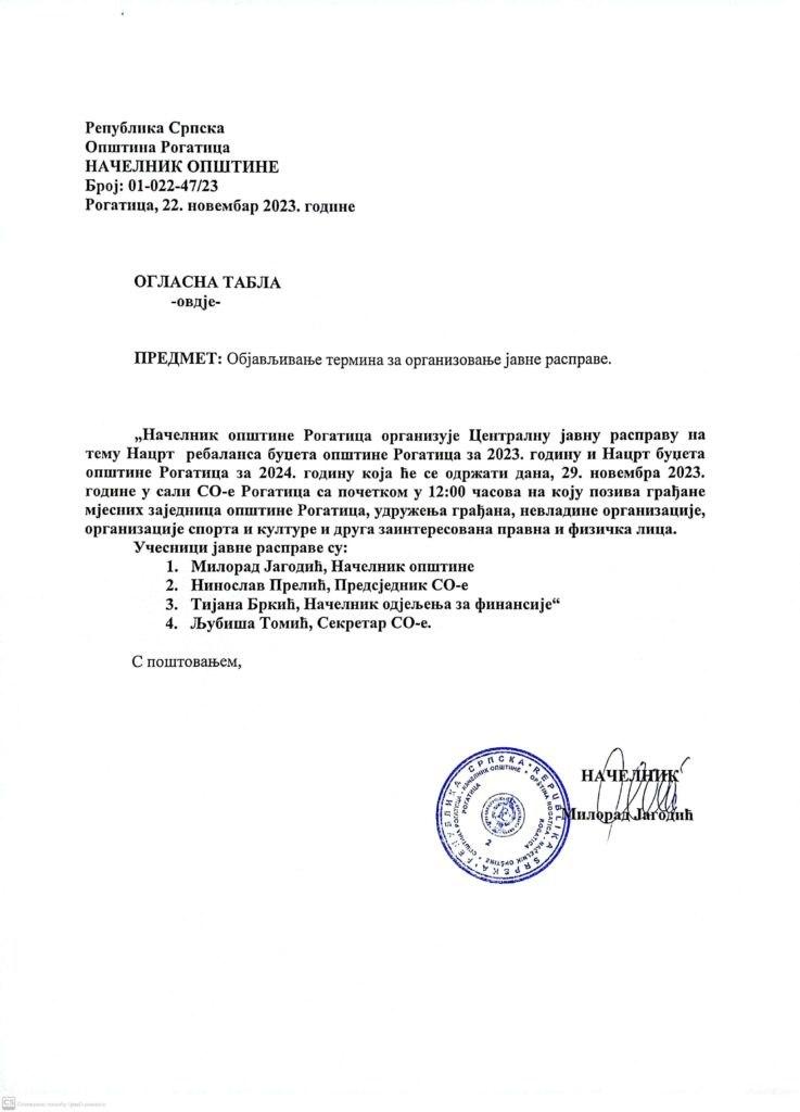 Заказана централна јавна расправа о Нацрту ребаланса буџета за 2023. и Нацрту буџета општине Рогатица за 2024. годину