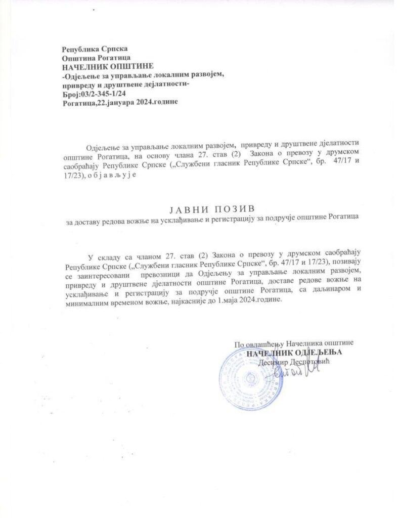 Јавни позив за доставу редова вожње на усклађивање и регистрацију за подручје општине Рогатица
