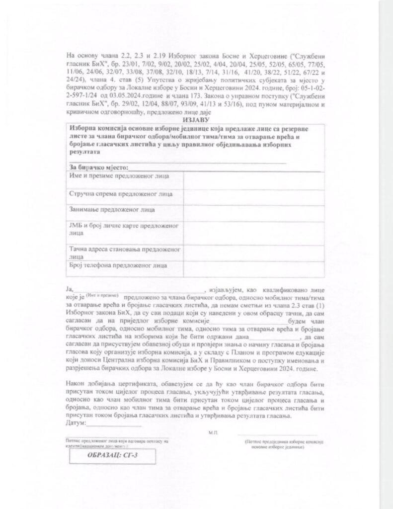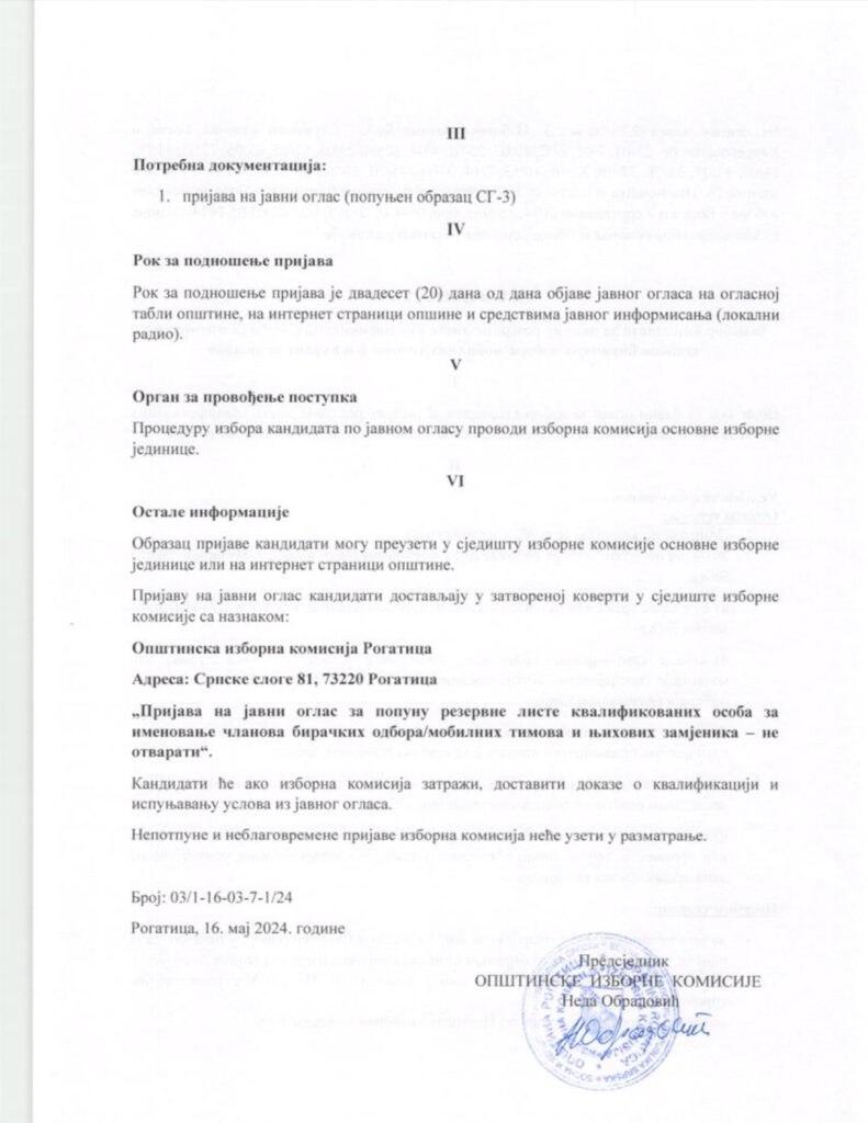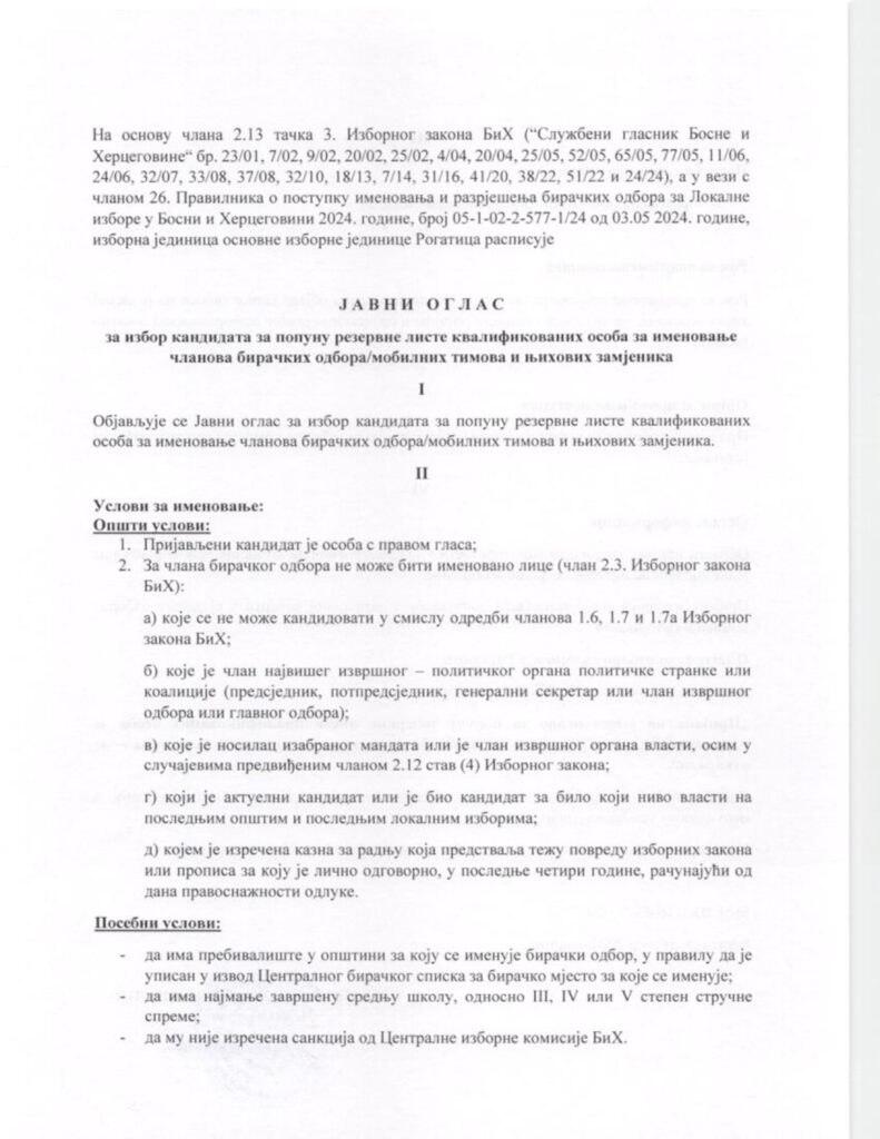 Јавни оглас за избор кандидата за попуну резервне листе квалификованих особа за именовање чланова бирачких одбора/мобилних тимова и њихових замјеника