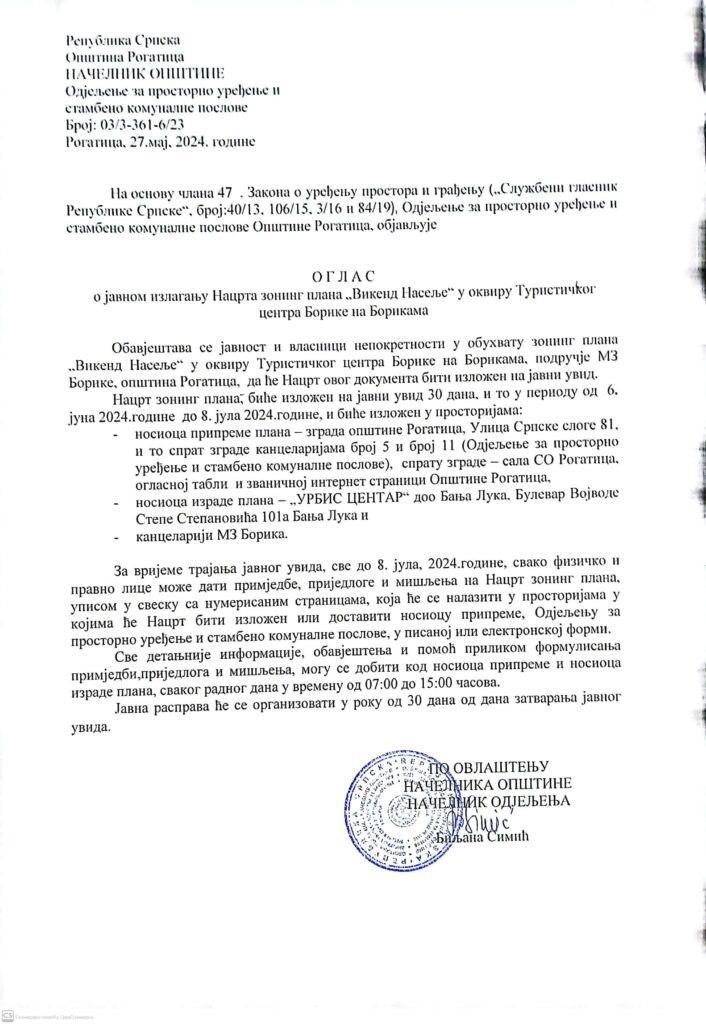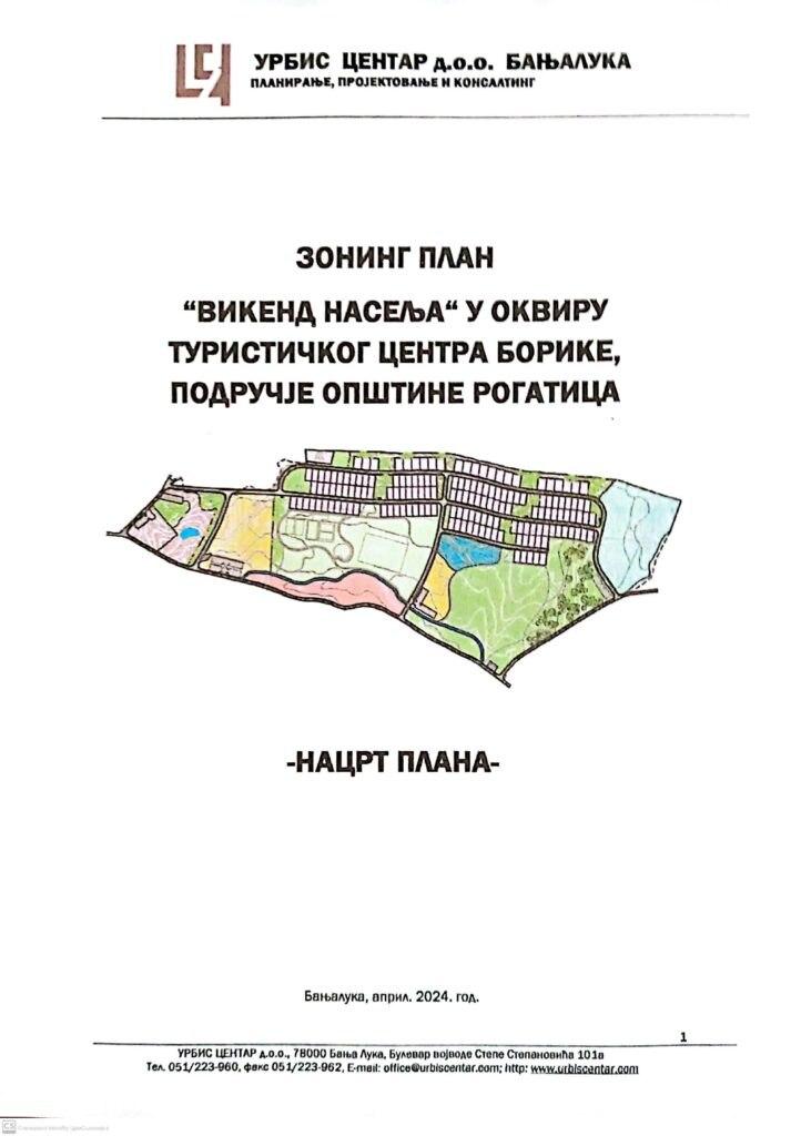Оглас о јавном излагању Нацрта зонинг плана “Викенд насеље” у оквиру Туристичког центра Борике на Борикама