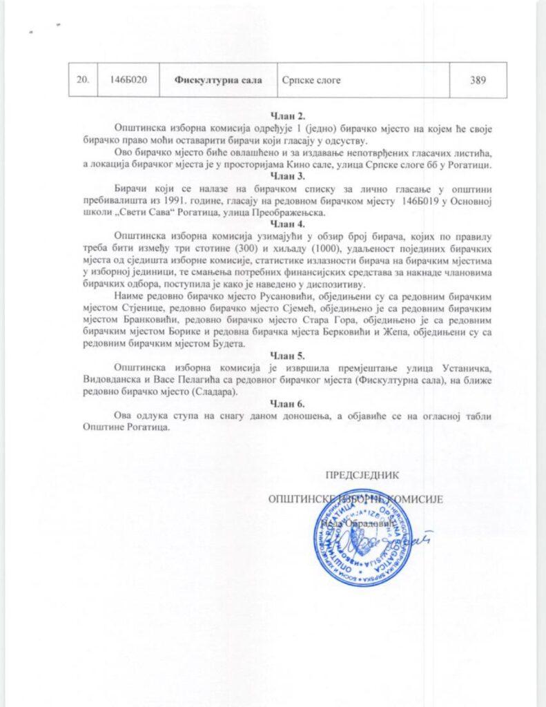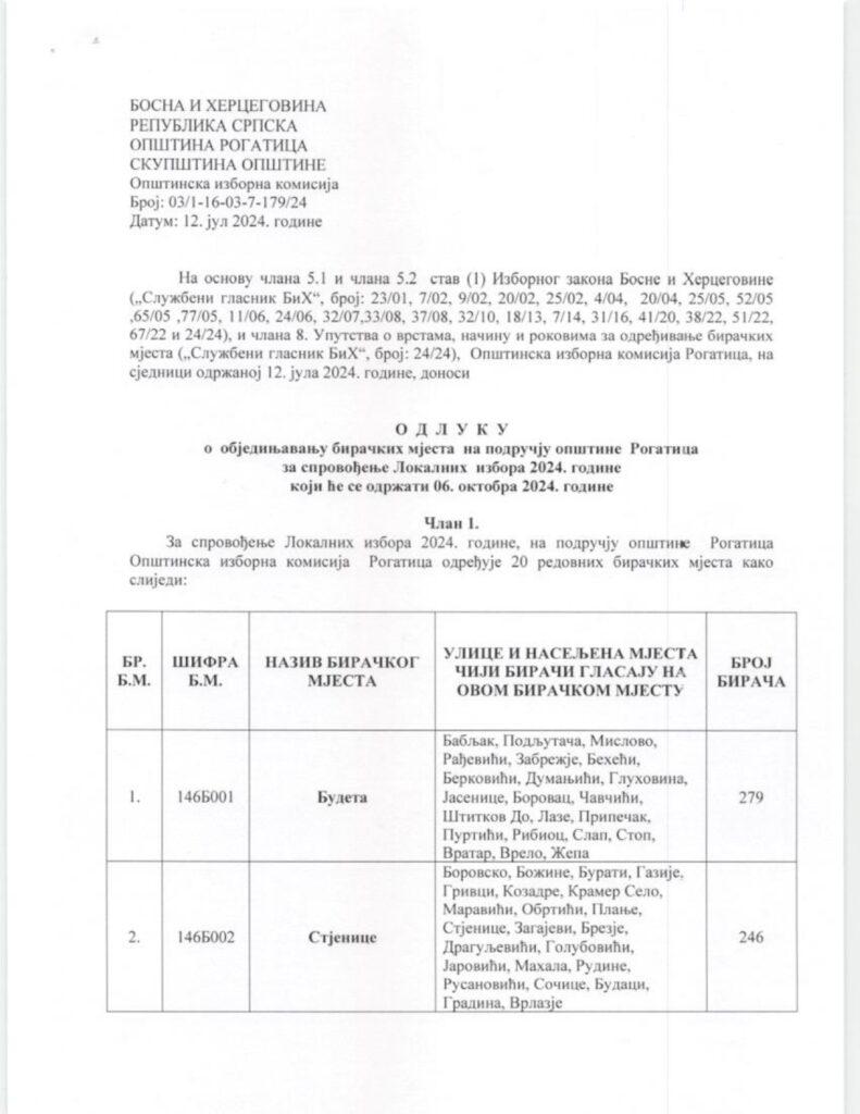 Одлука о обједињавању бирачких мјеста на подручју општине Рогатица за спровођење Локалних избора 2024. године који ће се одржати 6. октобра 2024. године