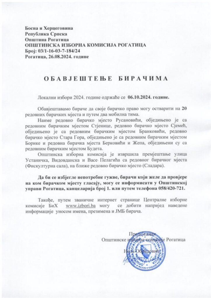 ОИК Рогатица – Обавјештење бирачима