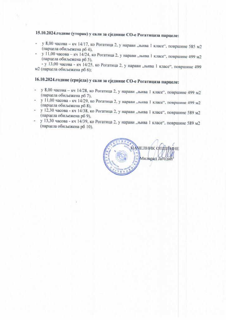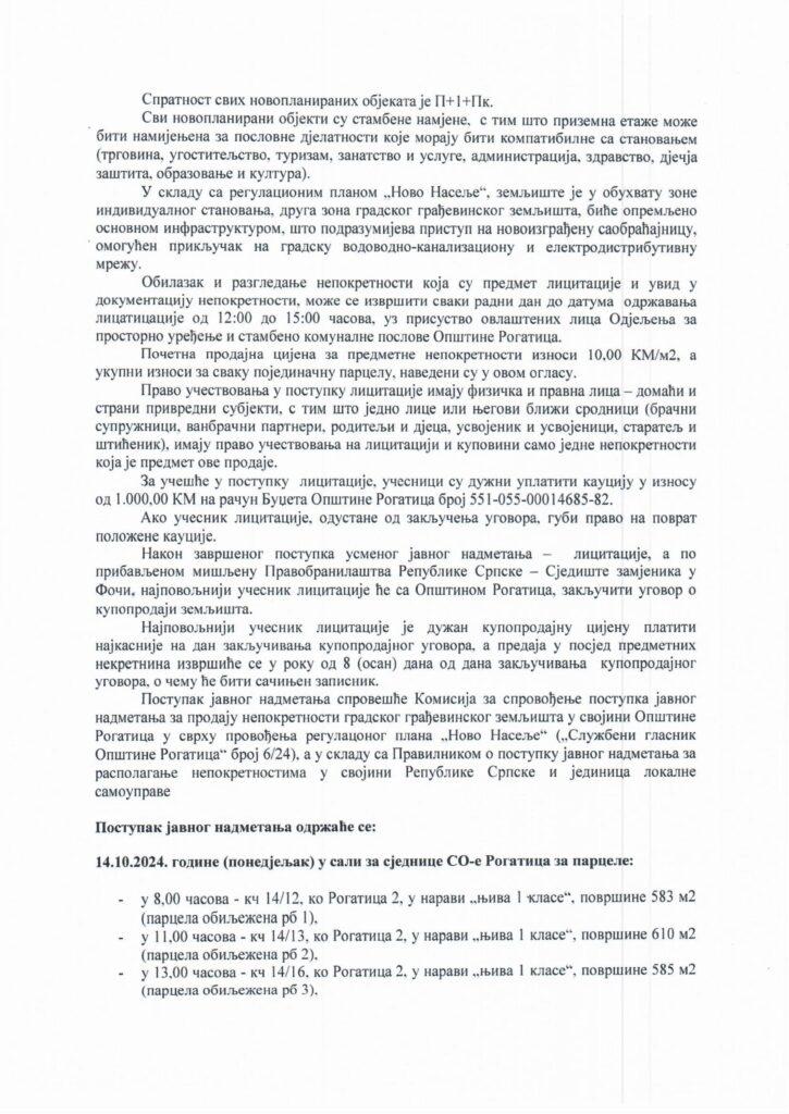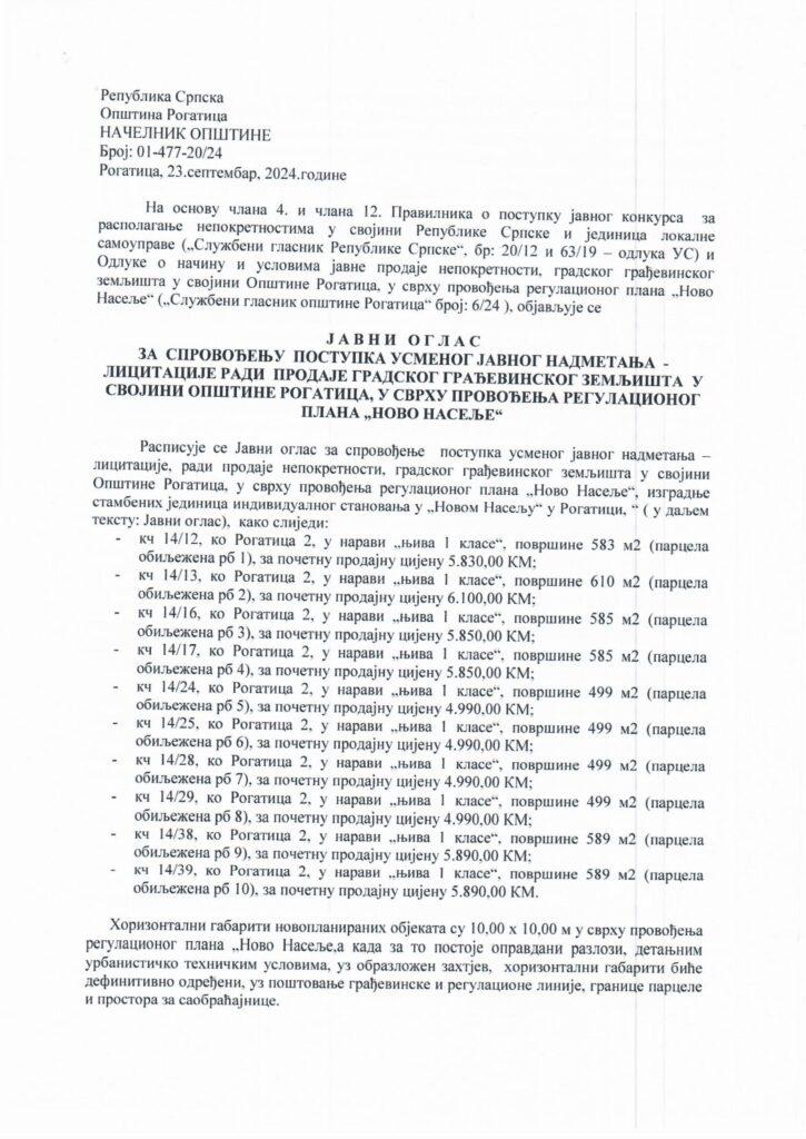 Јавни оглас за спровођење поступка усменог јавног надметања – лицитације ради продаје градског грађевинског земљишта у својини Општине Рогатица, у сврху провођења Регулационог плана “Ново насеље”