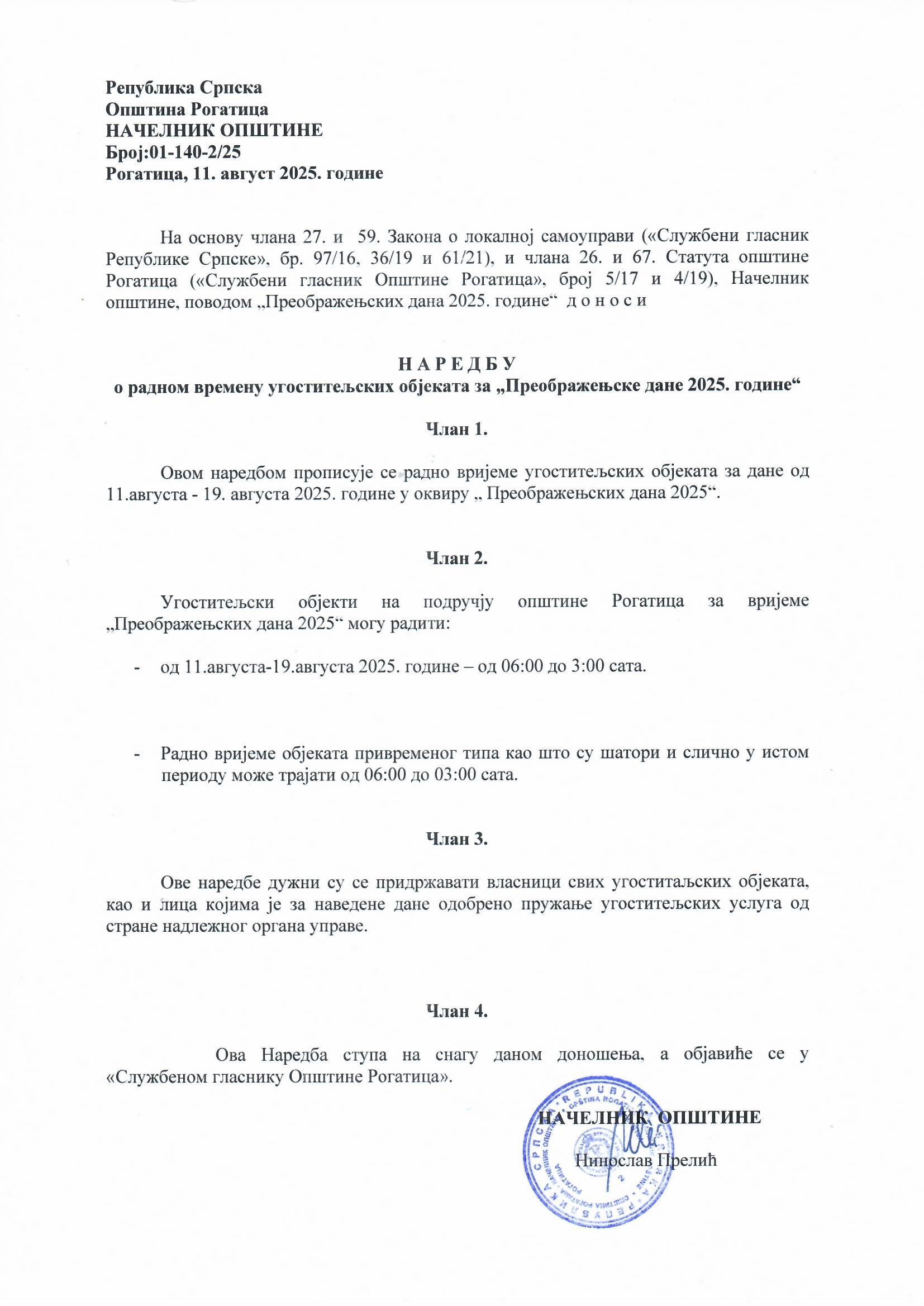 Начелник општине Рогатица, поводом “Преображењских дана 2025. године” доноси Наредбу о радном времену угоститељских објеката за “Преображењске дане 2025”.