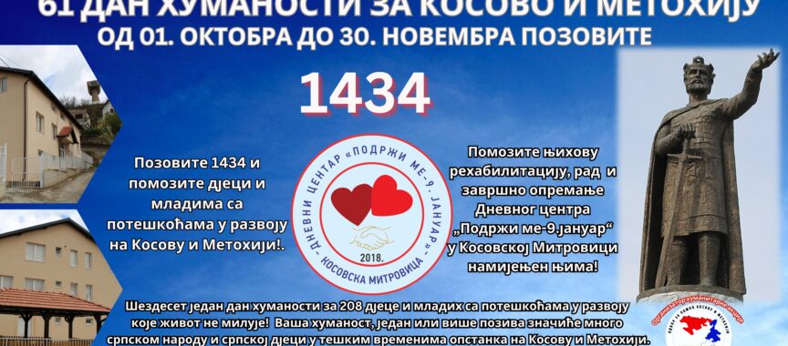 Од 1. октобра до 30. новембра активан је хуманитарни број 1434 у оквиру кампање „61 дан хуманости за Косово и Метохију“, коју спроводи Одбор за помоћ Косову и Метохији из Републике Српске.