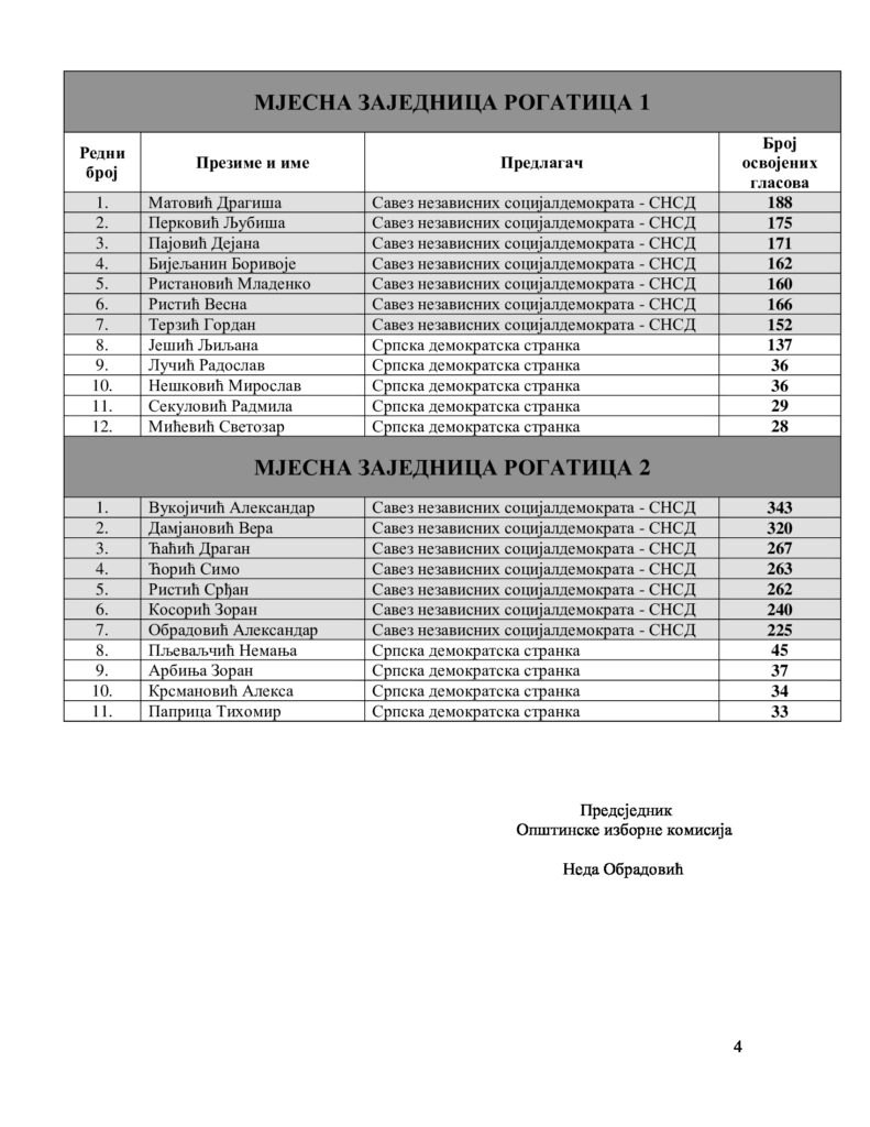 Према прелиминарним резултатима избора за чланове савјета мјесних заједница општине Рогатица, убједљиву побједу однио је Савез независних социјалдемократа са 80% освојених гласова. Независни кандидати освојили су 11%, а Српска демократска странка 9% гласова.